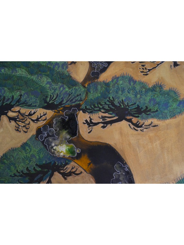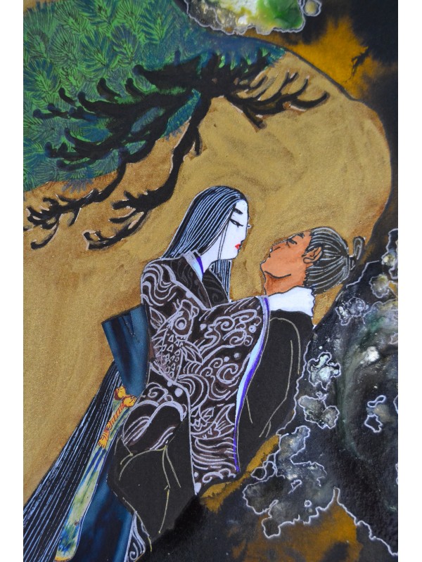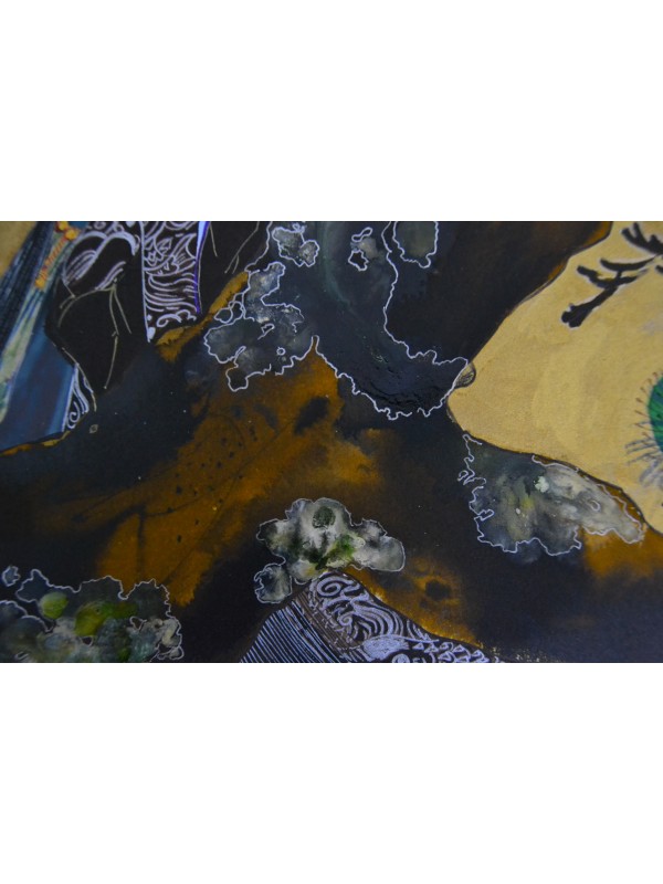 Ilustrație realizată în tehnică mixtă pe hârtie de calitate: tuș negru, sepia, mov, alb, verde și maro, liner auriu, mov și negru, marker colorat, creioane cu mină grasă și colaj.