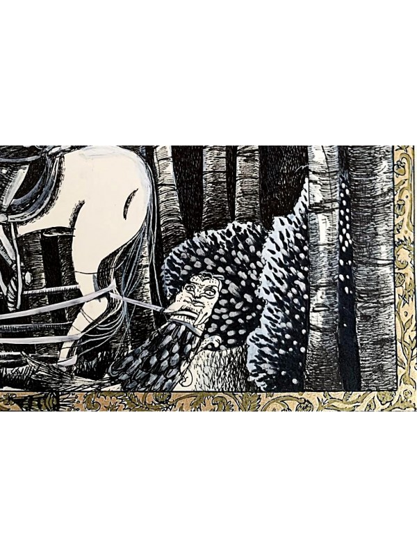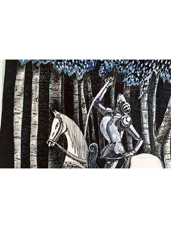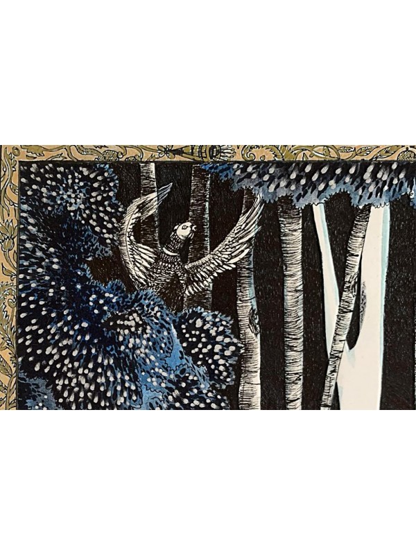 Ilustrație realizată în tehnică mixtă pe hârtie de calitate: tuș albastru și auriu, straturi de liner negru, marker negru, argintiu, auriu.